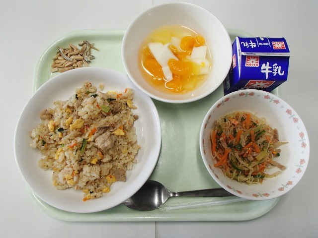 牛乳、いりこナッツ、焼き肉チャーハン、春雨サラダ、杏仁豆腐