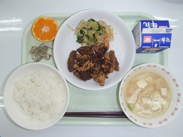 牛乳、煮干し、ご飯、レバーの甘辛煮、ごま酢和え、豆腐のみそ汁、みかん