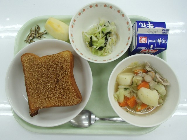 牛乳、煮干し、シナモンセサミトースト、フレンチサラダ、ポトフ、りんご