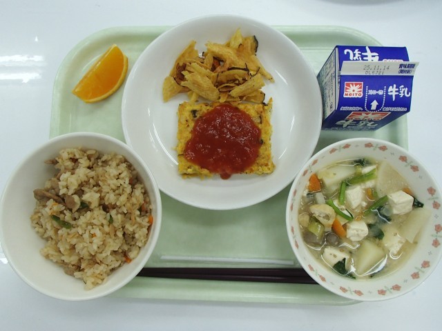 牛乳、するめ入り混ぜご飯、中華風卵焼き、野菜チップス、お講汁、オレンジ