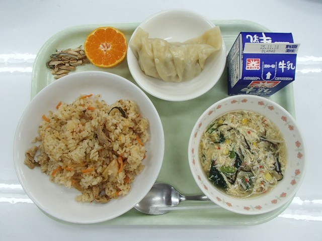 牛乳、いりこナッツ、キムタクチャーハン、手作り餃子、もずくのスープ、みかん