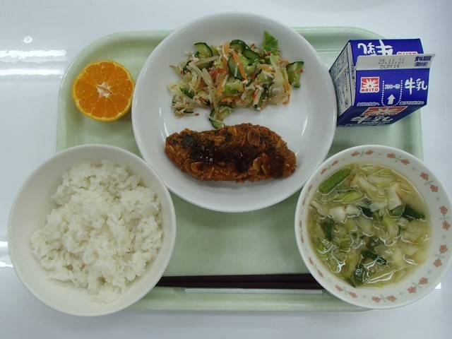 11月14日(金)の給食 公開日 2025/11/14 更新日 2025/11/14 給食 牛乳、ご飯、さわらのナッツフライ、和風サラダ、キャベツのみそ汁、みかん我孫子産野菜の日今井茂良さんのキャベツ(中峠)、石上清子さんの小松菜(岡発戸)を給食に使っています。