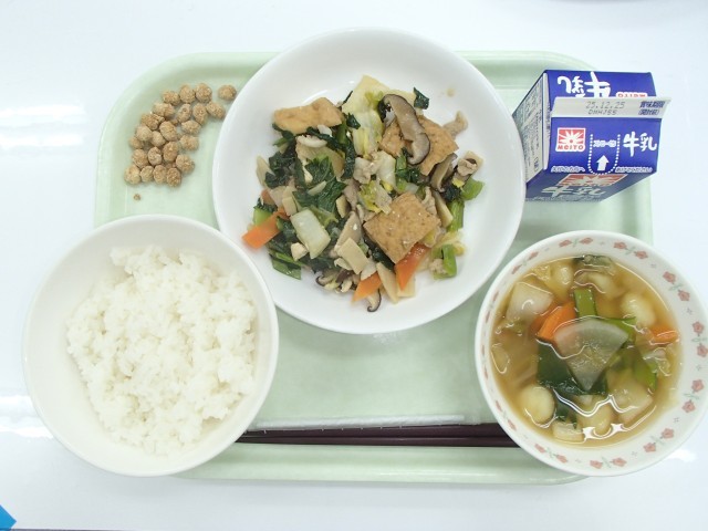 牛乳、ご飯、厚揚げの中華煮、じゃがいも団子汁、きなこ大豆