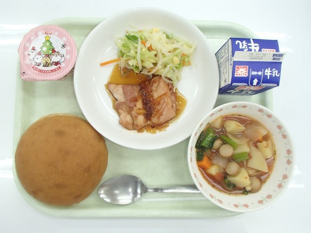 牛乳、丸パン、ローストチキン、フレンチサラダ、ミネストローネ、クリスマスカップデザート