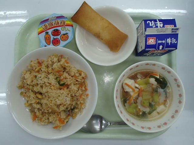 牛乳、キムチチャーハン、ポテト春巻き、青梗菜と豆腐のスープ、野菜果実ゼリー