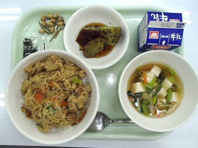 牛乳、油麩丼(きざみのり)、小松菜のすまし汁、大豆小魚、大学芋
