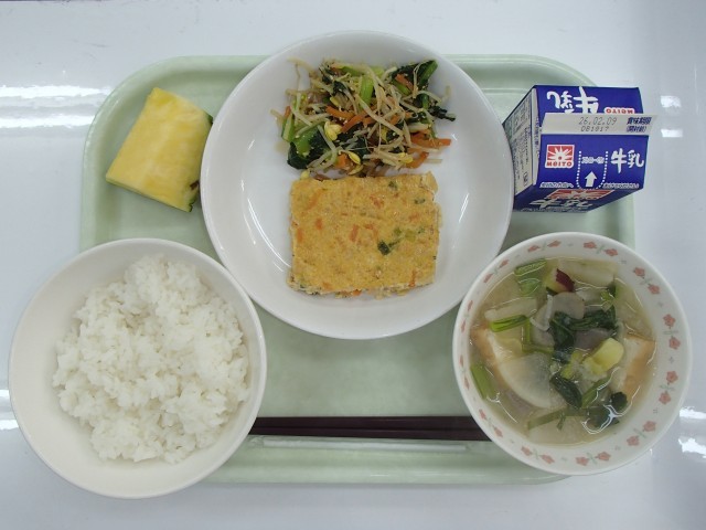 牛乳、ご飯、擬製豆腐、大豆もやしのナムル、さつま汁、パイナップル