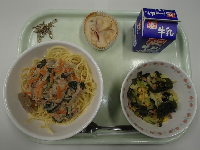 牛乳、ツナクリームスパゲティ、わかめサラダ、煮干し、米粉のアップルケーキ