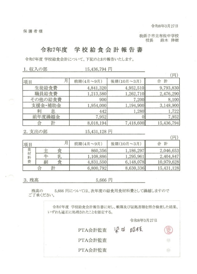 令和7年度 学校給食会計報告について 公開日 2026/03/30 更新日 2026/03/30 給食 3月27日 学校給食会計についての監査が終わりましたのでご報告いたします。本校の学校教育活動および学校給食にご理解とご協力を賜り誠にありがとうございました。布佐中学校