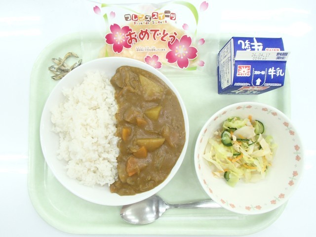 牛乳、ポークカレーライス、いかくんサラダ、煮干し、お祝いクレープ