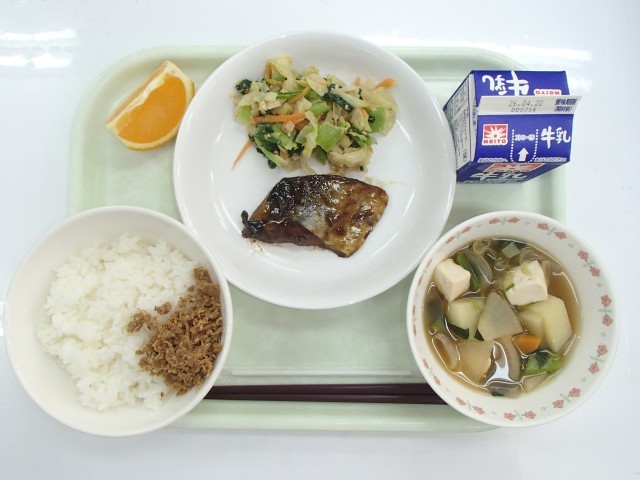 牛乳、ご飯、ツナふりかけ、さばのソース煮、ごま酢和え、けんちん汁、清見