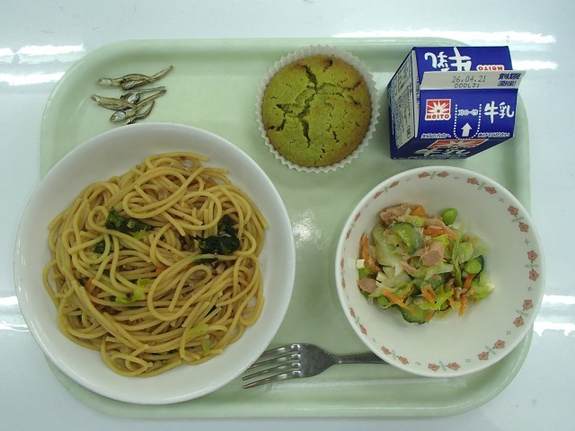 牛乳、和風ペペロンチーノ、枝豆とツナのサラダ、煮干し、豆腐と抹茶のケーキ
