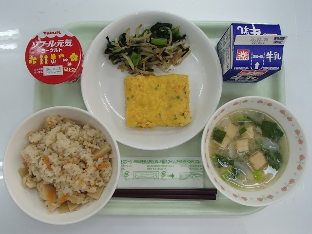 牛乳、筍ご飯、千種焼き、野菜の磯か和え、玉ねぎと生揚げのみそ汁、ヨーグルト