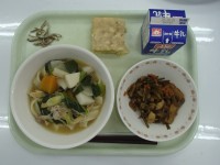 牛乳、ご飯、厚揚げの中華煮、じゃがいも団子汁、きなこ大豆