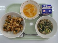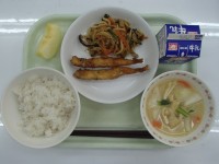 牛乳、鶏ごぼうご飯、ししゃもの天ぷら、和風サラダ、豆腐のみそ汁、ネーブル