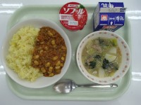 牛乳、ターメリックライス、チリコンカーネ、野菜スープ、ヨーグルト