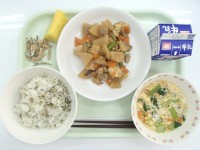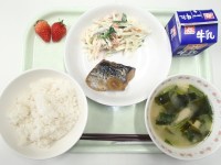 牛乳、ご飯、ツナふりかけ、さばのソース煮、ごま酢和え、けんちん汁、清見