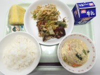 牛乳、ご飯、レバニラ炒め、切り干し大根のナムル、サンラータン、チーズ、パイナップ...