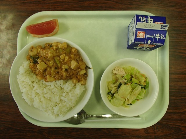本日のメニュー:牛乳 ご飯 豆腐とえびのチリ煮 ささみと野菜のナムル グレープフルーツ