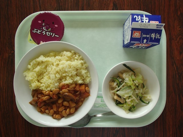 本日のメニュー:牛乳 コスタリカライス じゃこサラダ ブドウゼリー