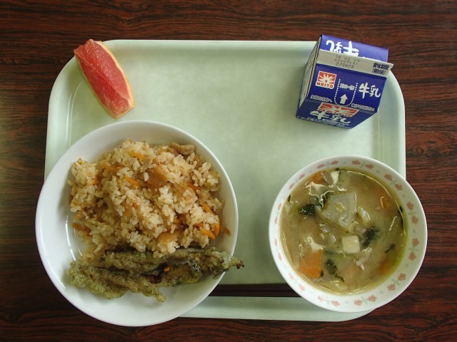 本日のメニュー:牛乳 キムタクご飯 ししゃもの磯部揚げ 豚汁 グレープフルーツ