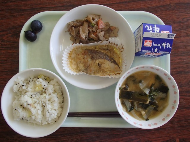 本日のメニュー:牛乳 さつまいもおこわ メルルーサのキノコマヨネーズ焼き 五目きんぴら かぼちゃと玉ねぎのみそ汁