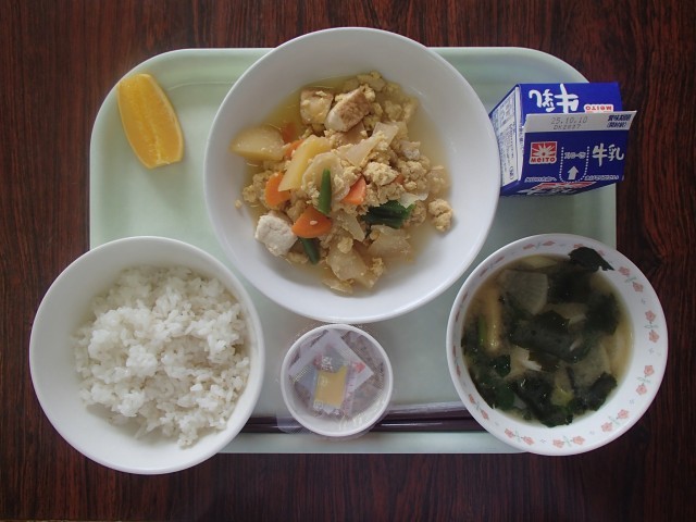 本日のメニュー:牛乳 ご飯 納豆 親子煮 大根のみそ汁 オレンジ