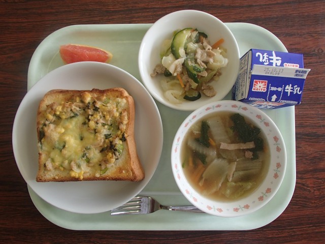 本日のメニュー:牛乳 ツナと卵のオープンサンド 焼肉サラダ 白菜スープ グレープフルーツ