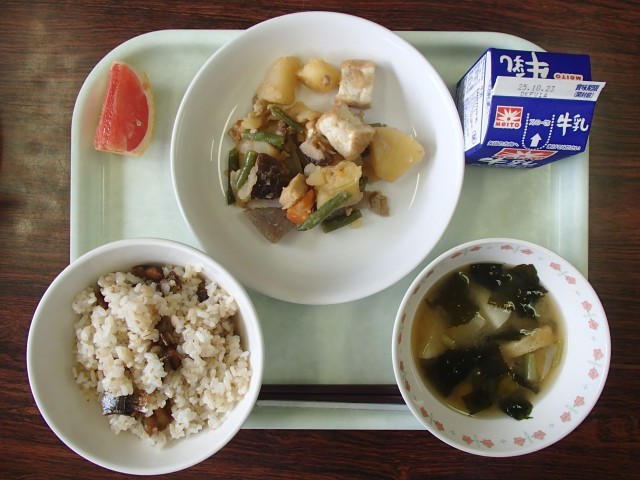 今日の給食 10月20日(月) 公開日 2025/10/27 更新日 2025/10/27 給食 本日のメニュー:牛乳 さんまご飯 生揚げと野菜のうま煮 かぶのみそ汁 グレープフルーツさんまご飯は短冊切りのさんまを揚げ、甘辛いたれをからめてご飯に混ぜた秋らしいご飯です。たれに千切りのしょうがを加えてさんまの臭みを抑えています。