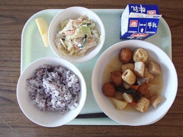 本日のメニュー:牛乳 ゆかりご飯 おでん れんこんサラダ りんご