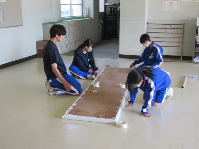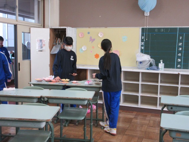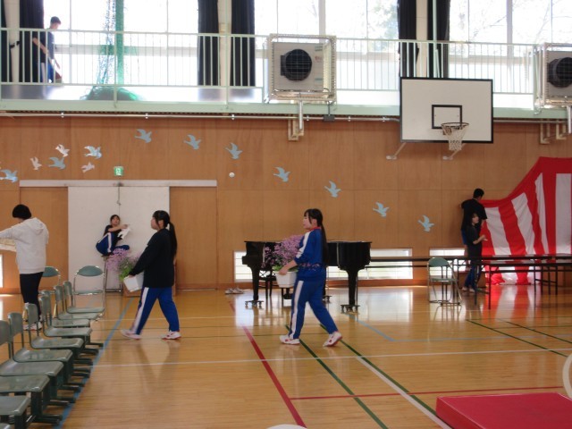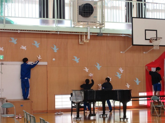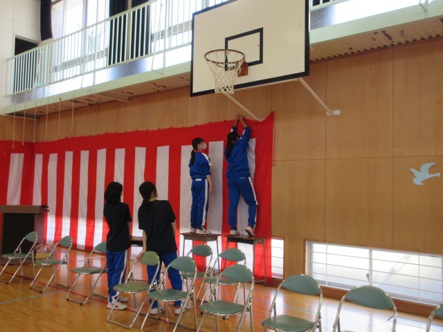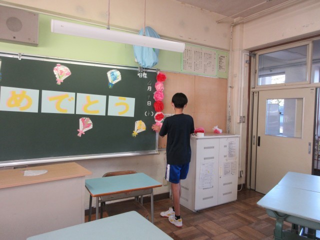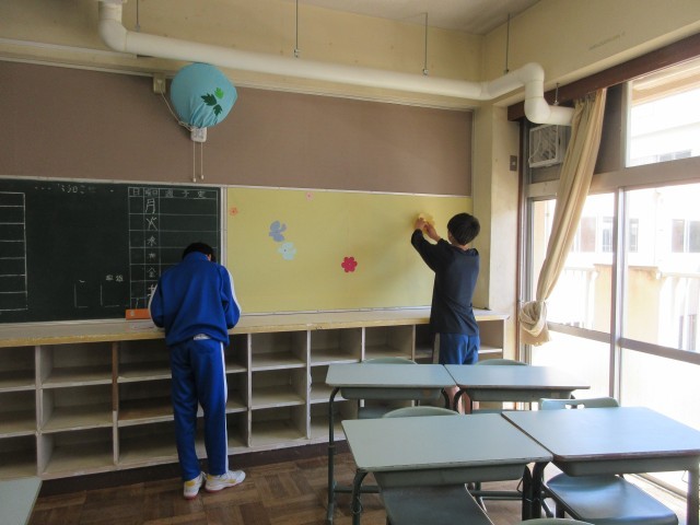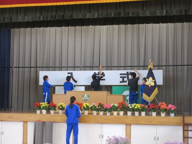 午後は、入学式準備をしました。卒業式の時と同じ分担で行ったので、スムーズに準備が進みました。新入生のために、一生懸命に会場づくりや装飾をしていました。