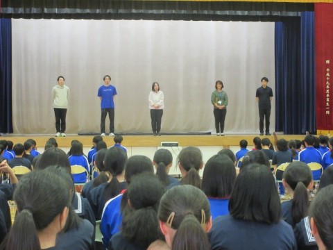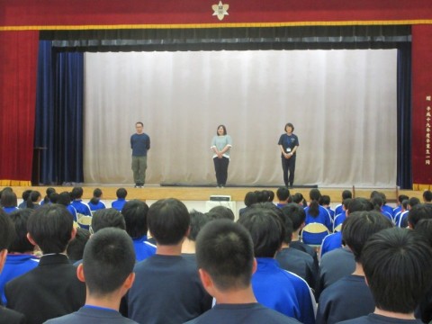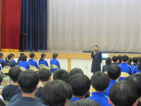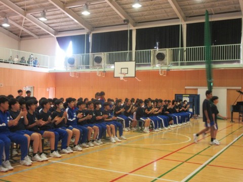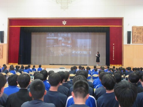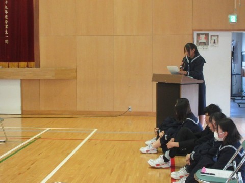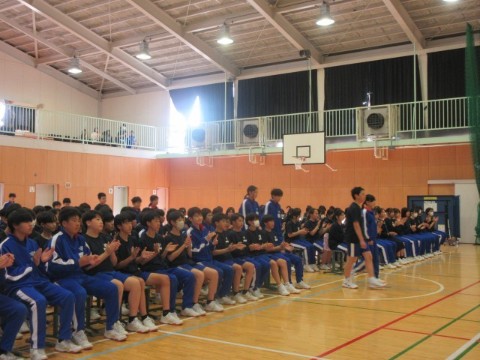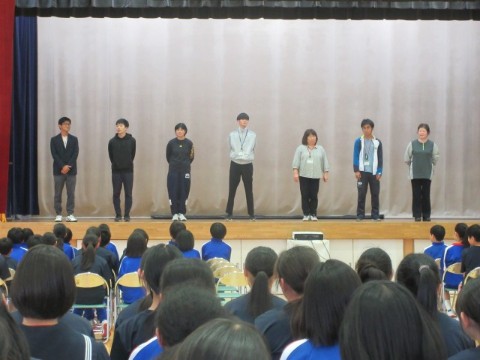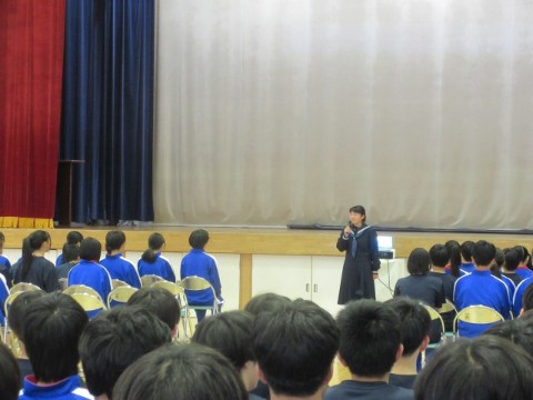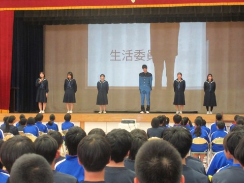 新入生歓迎集会を行いました。前半は、生徒会長の歓迎の言葉から始まり、執行部の紹介、生徒会活動の紹介、専門委員会の紹介、2・3年生とあしたば学級の先生たちの紹介をしました。生徒会執行部や先生たちの紹介は、個性あふれた紹介となり盛り上がりました。後半は、1年生が楽しみにしていた部活動の紹介です。短い時間にも、それぞれの部活動の様子がわかるように工夫がされていました。最後は、1年生がお礼に校歌を歌いましたが、3番はサプライズで2・3年生も一緒に歌いました。