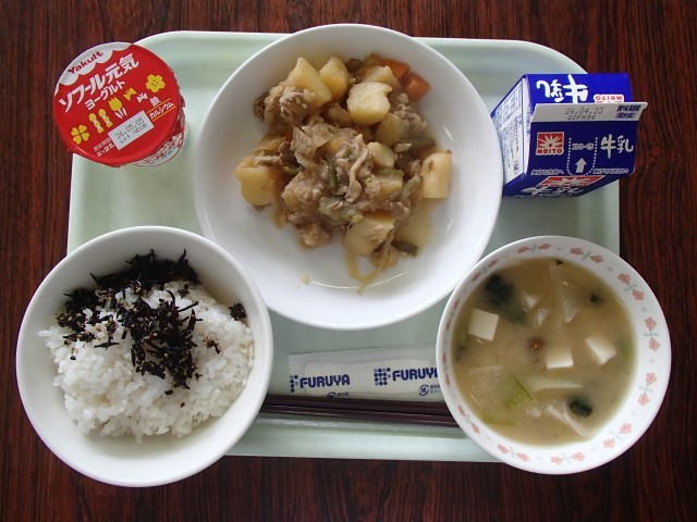 本日のメニュー:牛乳 ご飯 手作りひじきふりかけ 肉じゃが なめこのみそ汁 ヨーグルト
