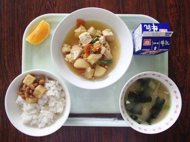 今日の給食 4月24日(金) 公開日 2026/04/27 更新日 2026/04/27 給食 本日のメニュー7:牛乳 ご飯 まめまめみそ豆 親子煮 大根のみそ汁 オレンジまめまめみそ豆は、高野豆腐と大豆を油で揚げ、みそだれをからめた料理です。成長期に特に大切な栄養、たんぱく質、カルシウム、鉄をとることができます。