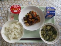 牛乳 豆腐のうま煮丼 切り干し大根のナムル スイート春巻き