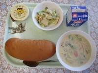 ・牛乳・コッペパン・秋の香りのシチュー・キャベツとりんごのサラダ・煮干し・豆乳プ...