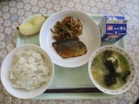 牛乳 ご飯 さばのカレー焼き 五目きんぴら 豆腐と油揚げのみそ汁 りんご