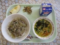 牛乳 ねぎ塩豚丼 わかめとコーンのスープ 大豆小魚カレー風味 りんご