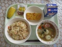 牛乳 シーフードピラフ チーズ入りオムレツ ポテトとコーンのスープ アーモンド ...