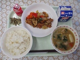 今日の給食は、我孫子市に練習拠点があるラグビーチーム、NECグリーンロケッツ東葛の応援献立です。