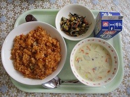 牛乳 チキンライス たらと白菜のクリーム煮 ひじきのごまドレサラダ 一口ぶどうゼリー