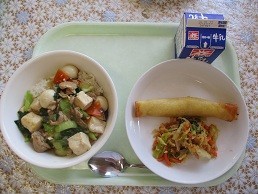 牛乳 豆腐のうま煮丼 切り干し大根のナムル スイート春巻き