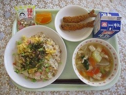 【節分の献立】 牛乳 油揚げの混ぜ寿司 いわしのカリカリフライ 田舎汁 福豆 不知火