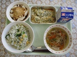 【立春の献立】 牛乳 菜の花ご飯 さわらのカレーマヨ焼き 沢煮椀 豆乳デザートきなこ黒みつがけ