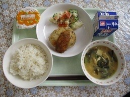 牛乳 ご飯 和風ハンバーグおろしがけ じゃがいもとツナのサラダ なめこのみそ汁 みかんゼリー