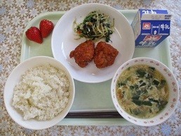 牛乳 ご飯 ヤンニョムチキン のりのナムル にら玉スープ いちご