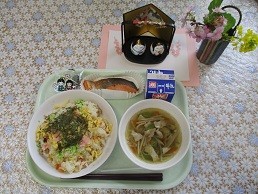【桃の節句献立】牛乳 五目ちらし寿司 鮭の幽庵焼き 沢煮椀 一口大福