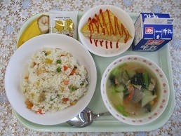 牛乳 シーフードピラフ チーズ入りオムレツ ポテトとコーンのスープ アーモンド バナナ