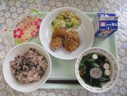 【卒業お祝い献立】赤飯 鶏肉のから揚げ キャベツとりんごのサラダ 紅白はんぺんのすまし汁 お祝いクレープ