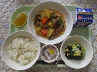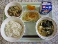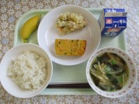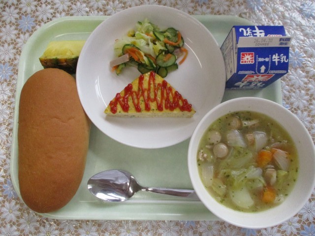 牛乳 コッペパン チーズ入りオムレツ レモンドレッシングサラダ ポトフ パイナップル